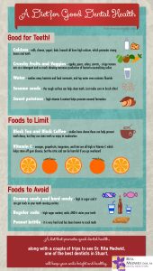 Most people know about the importance of brushing, flossing, and visiting your dentist for regular cleanings, but many don’t know the importance of the roll your diet plays in your dental health. Here is a helpful infographic that goes over foods that are good, foods that are bad, and foods that are beneficial in moderation. Remember, even with the best dental health diet it is important to visit your dentist in Stuart regularly.